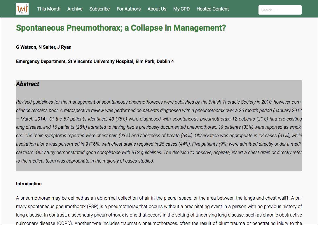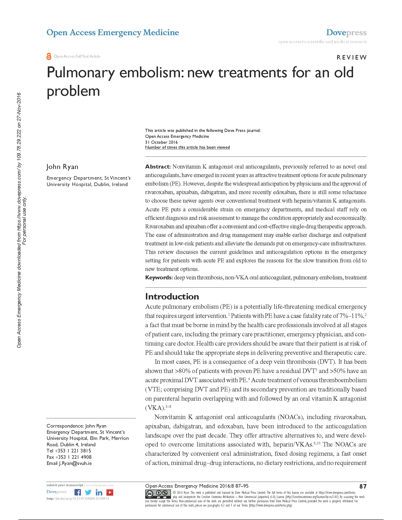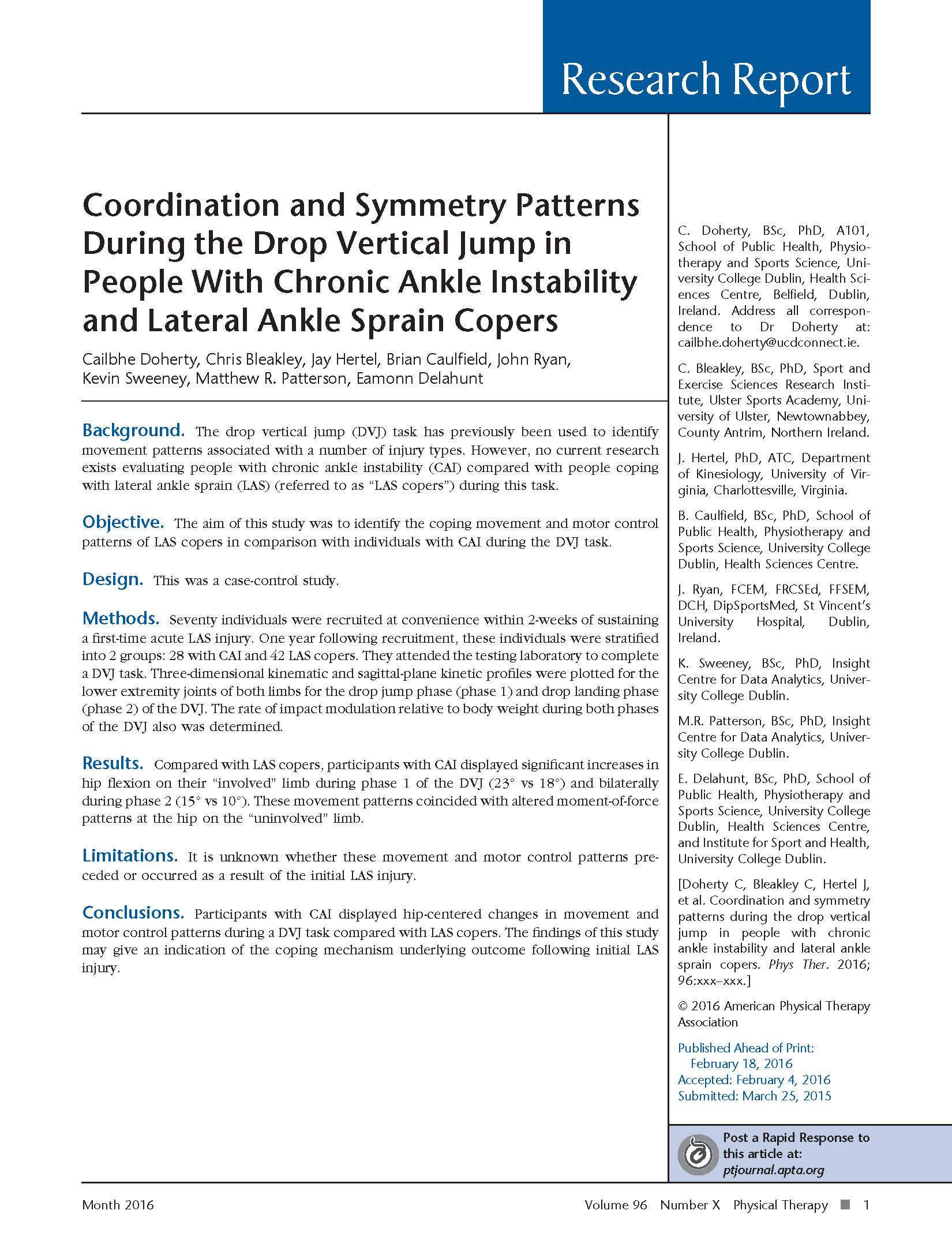 2016 Publications Pulmonary embolism: new treatments for an old problem John Ryan Full-text · Article · Oct 2016 · Open Access Emergency Medicine Palliative Care at the front Door – Improving recognition of Palliative Care Needs of Patients Attending an Irish Emergency Department Tiernan E, Ryan J et al. Full-text – Palliative Medicine, June 2016; 30(6): NP41. Cycling Injuries Presenting to an Irish Emergency Department James Foley · John Cronin · Anna Gheorgescu · Denis Evoy · John M Ryan Article · Jun 2016 · Irish medical journal Gait Biomechanics in Participants, Six Months after First-time Lateral Ankle Sprain C. Doherty · C. Bleakley · J. Hertel · B. Caulfield · J. Ryan · E. Delahunt Full-text · Article · May 2016 · International Journal of Sports Medicine Spontaneous Pneumothorax; a Collapse in Management? Watson G, Salter N, Ryan J. Full-text Ir Med J. 2016 Mar 10;109(3):372. Recovery From a First-Time Lateral Ankle Sprain and the Predictors of Chronic Ankle Instability: A Prospective Cohort Analysis (SUPPLEMENTAL DOCUMENT) Cailbhe Doherty · Chris Bleakley · Jay Hertel · Brian Caulfield · John Ryan · Eamonn Delahunt Full-text · Dataset · Feb 2016 Recovery From a First-Time Lateral Ankle Sprain and the Predictors of Chronic Ankle Instability: A Prospective Cohort Analysis Cailbhe Doherty · Chris Bleakley · Jay Hertel · Brian Caulfield · John Ryan · Eamonn Delahunt Full-text · Article · Feb 2016 · The American Journal of Sports Medicine Coordination and Symmetry Patterns During the Drop Vertical Jump in Participants With Chronic Ankle Instability and Lateral Ankle Sprain Copers Cailbhe Doherty · Chris Bleakley · Jay Hertel · Brian Caulfield · John Ryan · Kevin Sweeney · Matthew R Patterson · Eamonn Delahunt No preview · Article · Feb 2016 · Physical Therapy